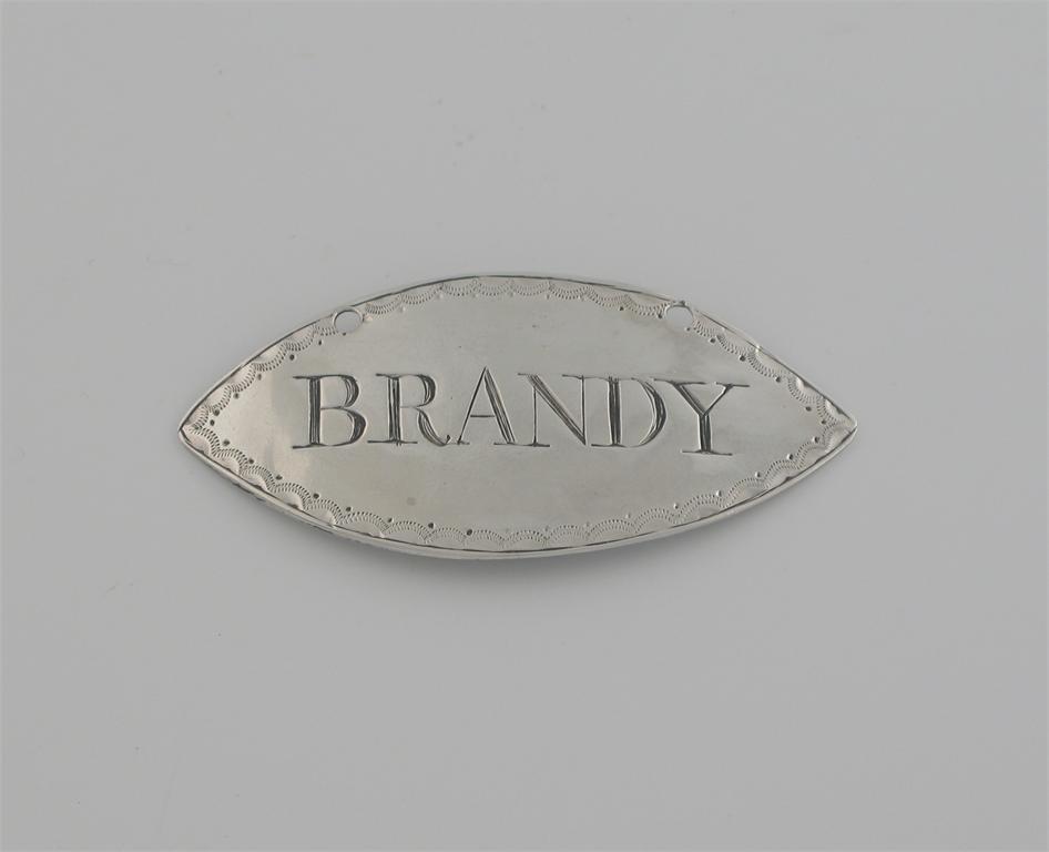 A George III navette shaped label, with a bright-cut border, incised 'BRANDY', by John Lambe, London c.1790.