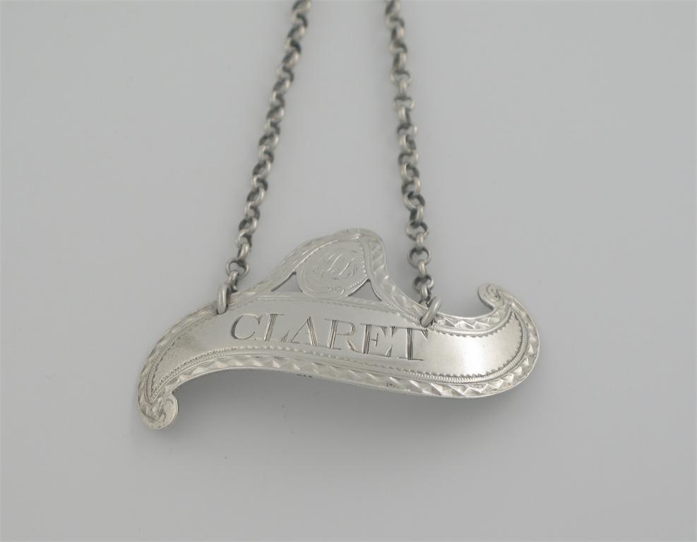 A George III bright-cut wine label, in the form of a scroll with a pierced oval cartouche surmount, initialled and incised 'CLARET', by James Phipps, London c.1775 (maker's mark only [twice]).