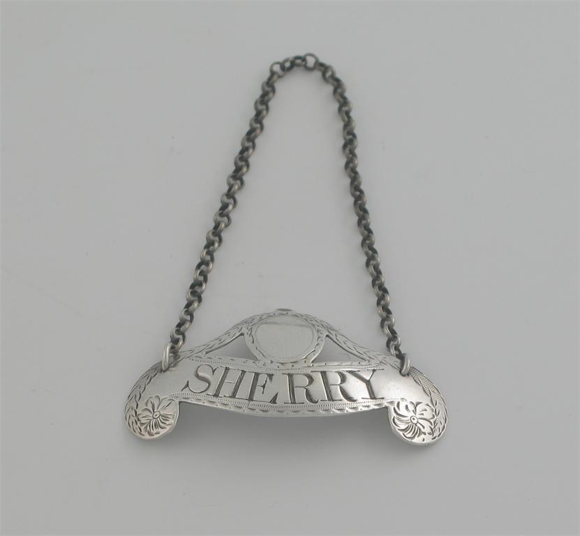 A George III curved wine label, with a pierced oval surmount and engraved festoon borders, incised 'SHERRY', by T. Phipps & E. Robinson, London c.1790.