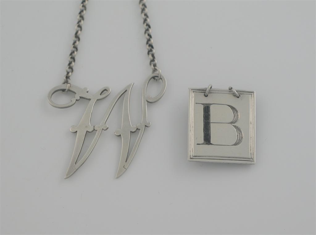 Two letter wine labels: a George III tablet incised and filled 'B' by T. Phipps & E. Robinson, London 1799, and a Victorian script 'W' label, by George Unite, Birmingham 1866. (2)