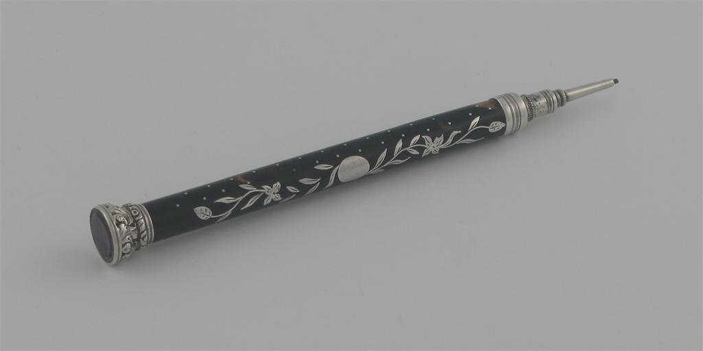 A William IV mounted telescopic tortoiseshell pencil, inlaid and pique work decoration, inset amethyst terminal, unmarked, c.1835, 3.6in (9.2cm) long.