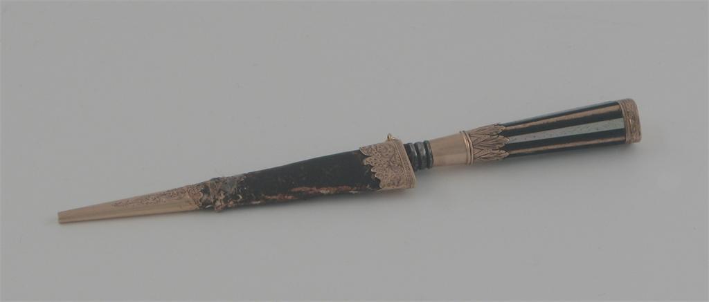 A 19th century gold mounted continental knife, the handle with alternating bands of ebony and mother of pearl, mounted leather sheath, steel blade, unmarked, 5in (12.7cm) long.