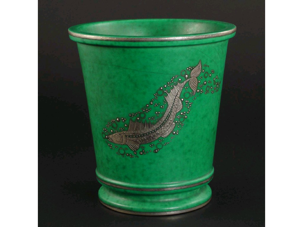 A Gustavsberg Argenta vase probably designed by Wilhelm Kage decorated in silver with a fish ...