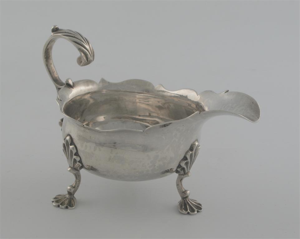 A George II cream boat, with a wavy rim and flying scroll handle, resting on three shell feet, the underside initialled 'AS', by William Shaw & William Priest, London 1754, 5in (12.8cm) long, 3.75oz.