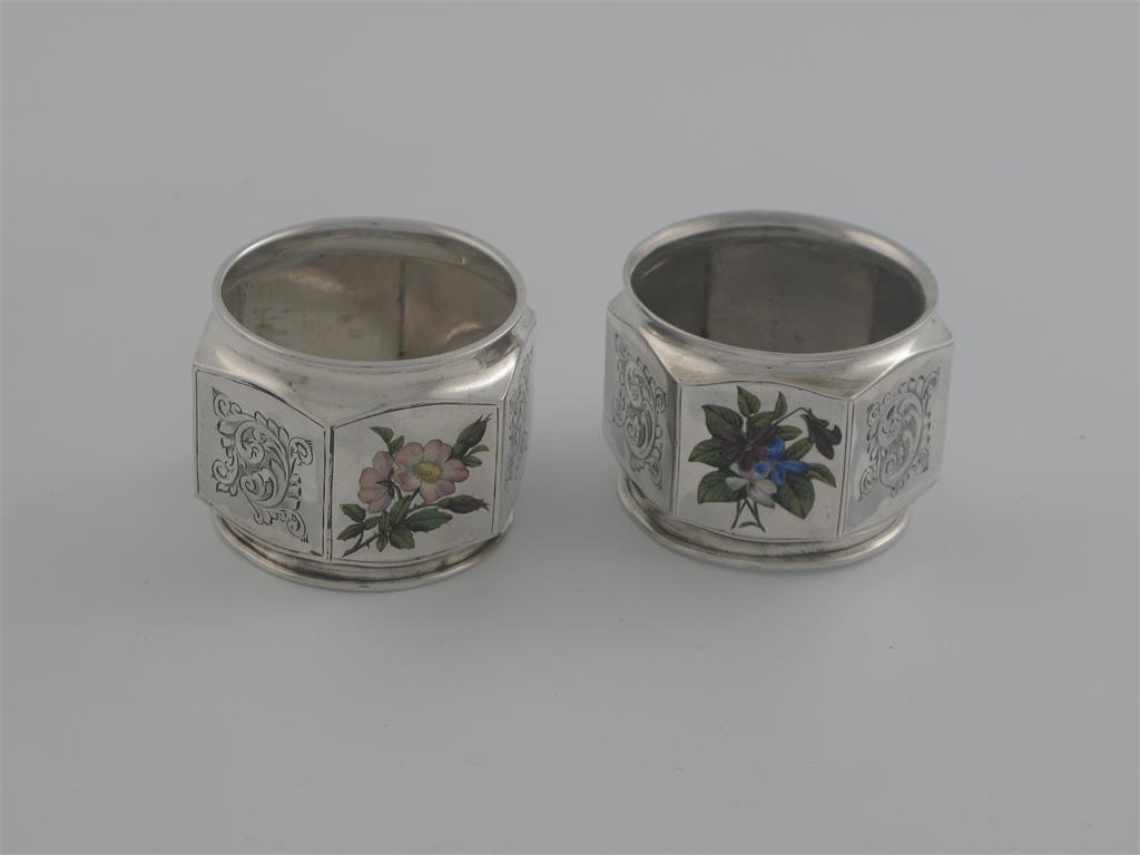 A pair of Victorian napkin rings, hexagonal sides, engraved decoration, and enamelled flowers, inscription 'SS from MC on her silver wedding 1864 June 26th 1889', by Edward Hutton, London 1888, and an engraved, cased, napkin ring by Edward Hutton, London 1888. (3)