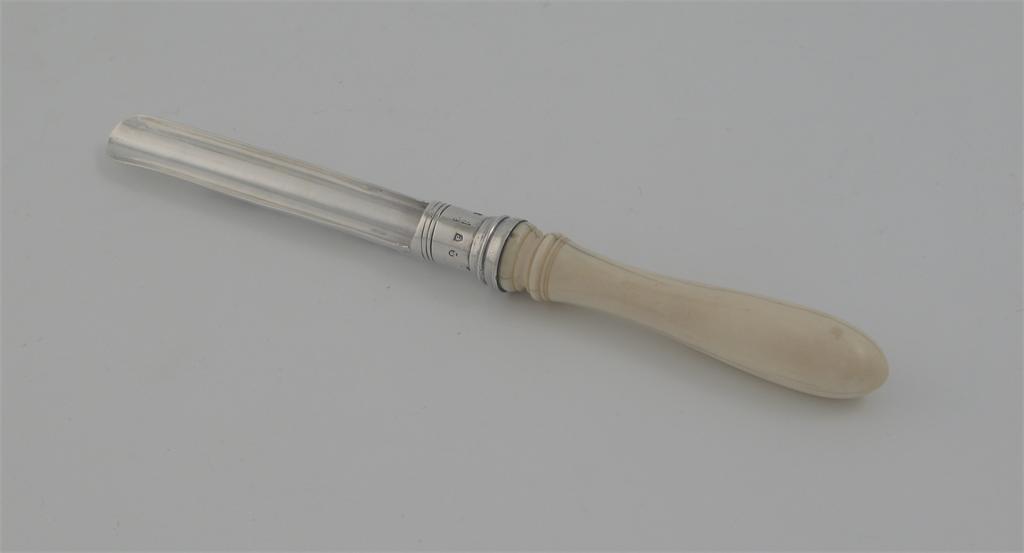 A George III apple corer, with a turned ivory handle, by Thomas Willmore, Birmingham 1802, 6.25in (16cm) long.