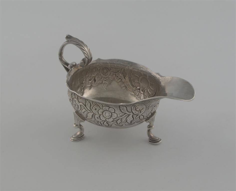 A George II creamboat on three feet, with a flying scroll handle, chased around the sides and under the lip with trailing flowers and a rocaille cartouche against a matt ground, crested, the underside with initials, date '1830' and scratchweight '3-17 1/2', by George Greenhill Jones, London 1739, 4.9in (12.4cm) long, 3.75oz.