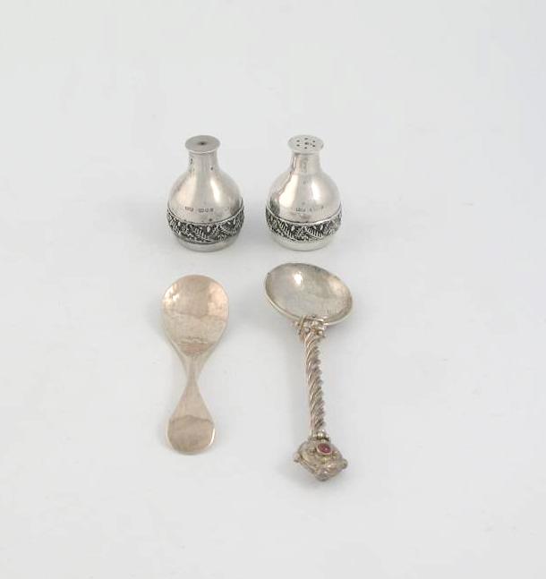 Four items of contemporary silver: a Scottish 'hammered' caddy spoon of waisted form, maker 'GLS', Edinburgh 1992, a pair of pepperettes with a textured frieze of ferns and acorns, maker 'HOL', London 1978 and a cast spoon with wrythen stem, the terminal set with a stone boss, maker 'MAB', London 1992, the latter 5.6in (14.3cm) long, 8oz. (4)