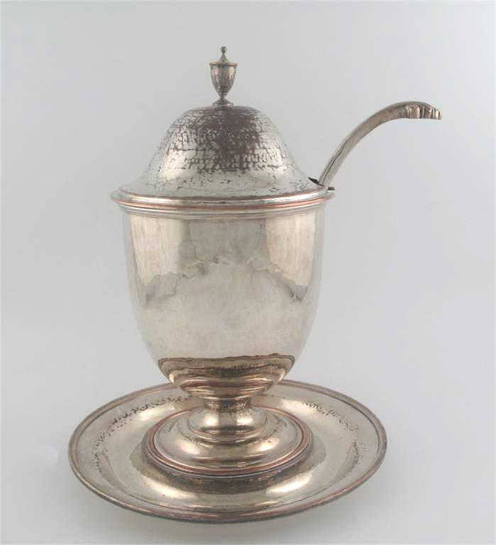 Duchess of Sutherland Cripples Guild plated vase shaped soup tureen, cover, stand and ladle, hammered finish, approximately 13in (33cm) high (without stand).