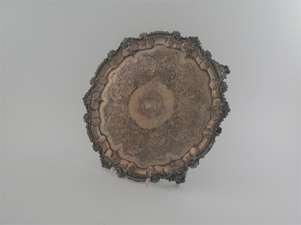 A Victorian salver, shaped outline, scroll and shell border, engraved decoration, monogrammed by Daniel and Charles Houle, London 1853, 11.75in (29.8cm) diameter, 25oz.