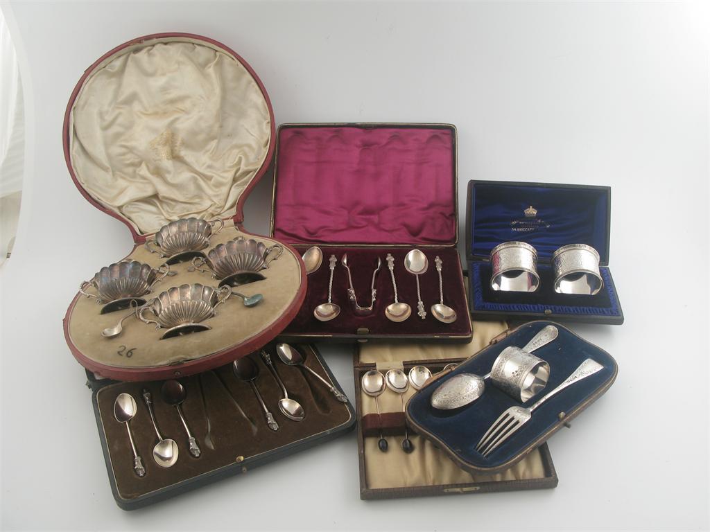 Six various cased sets; a fork, spoon and napkin ring, a pair of napkin rings, a coffee spoon with coffee bean terminals, two sets of six apostle top coffee spoons and tongs, and four salts with spoons, mixed makers and dates, 14oz weighable silver. (6)