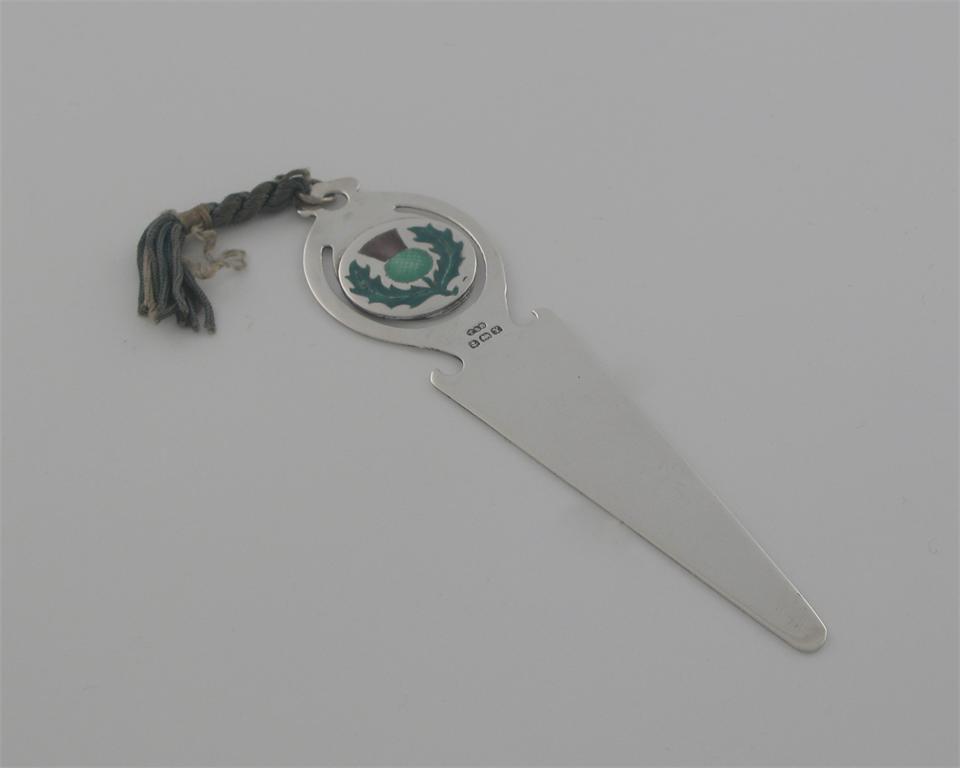 A modern book mark, with an enamelled thistle on the terminal, by Turner & Simpson, Birmingham 1948, 4.25in (10.8cm) long, 0.5oz.