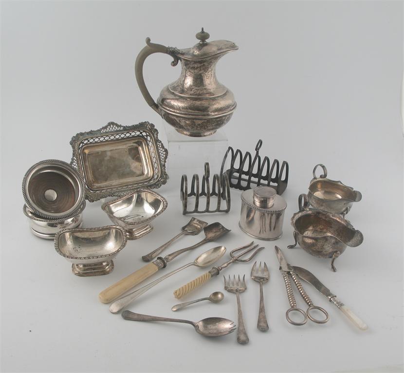 A mixed lot: a modern hot water jug, two sauce boats, a toast rack, a bon bon dish, and the following plated items: a pair of salts, a pair of small coasters, a tea caddy, a toast rack, and sundry flatware and cutlery, 29oz weighable silver. (Lot)