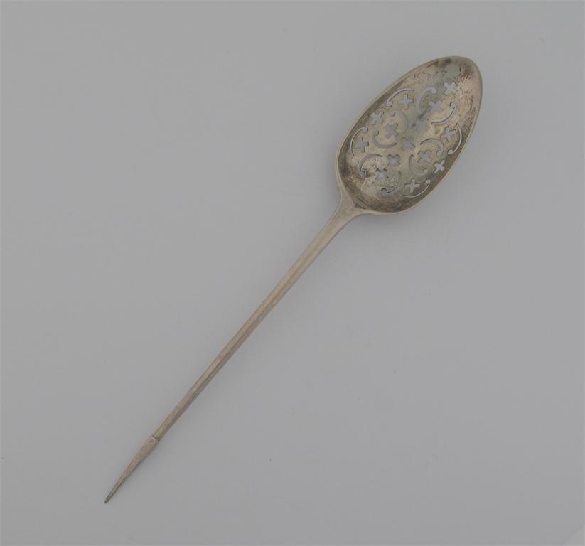 A George III mote spoon, with a dessert size bowl and a large tapering finial, by an unascribed maker 'FE', London c.1780 (no date letter), 6.9in (17.5cm) long.