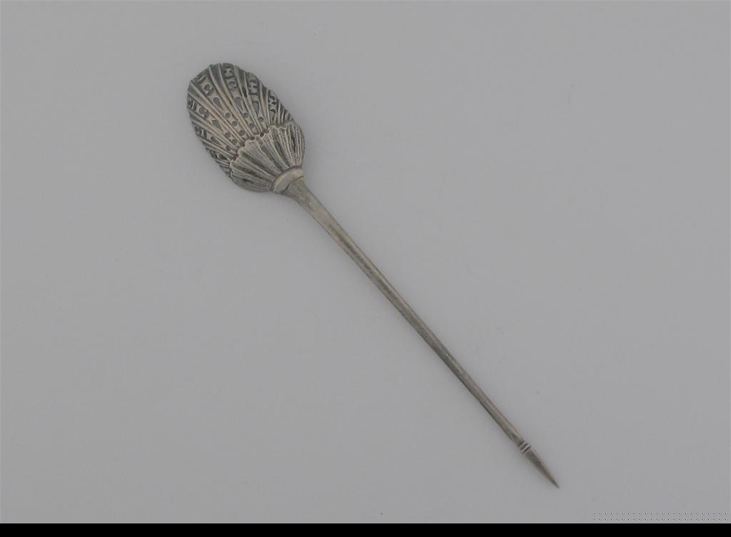 A George II cast mote spoon, the back of the bowl matted and fluted to resemble a shell, faceted finial, unmarked c.1750.
