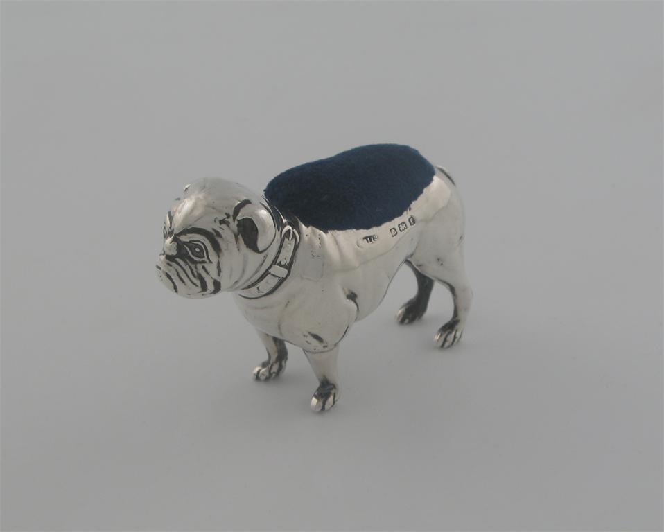An Edwardian novelty bulldog pin cushion, standing, by Adie & Lovekin Ltd., Birmingham 1905, 2.7in (6.6cm) long.