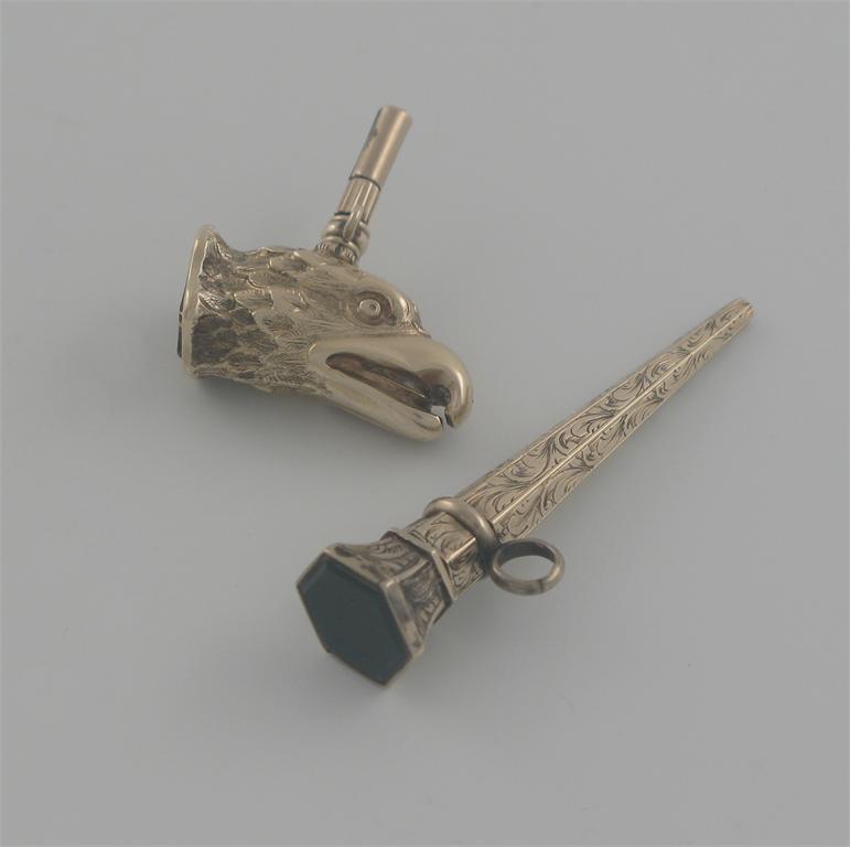 A 19th century hexagonal small telescopic pencil, with foliate engraving and inset uncarved bloodstone matrix, unmarked, and a watch key mounted with an eagles head and cartouche shaped carnelian. (2)
