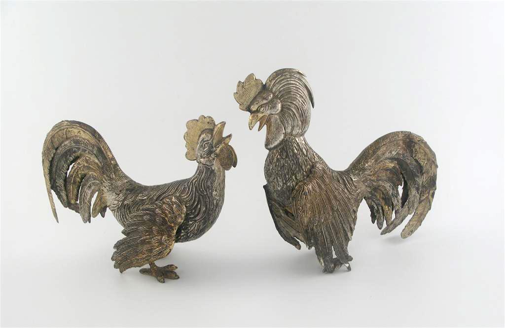 A pair of parcel-gilt Spanish metalware fighting cocks