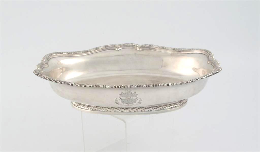 An early George III shaped oval dish, on a gadrooned rim foot with a shaped, gadrooned border and an engraved coat of arms on one side, by Thomas Heming, London 1765, 10.3in (26.2cm) long, 25oz.
