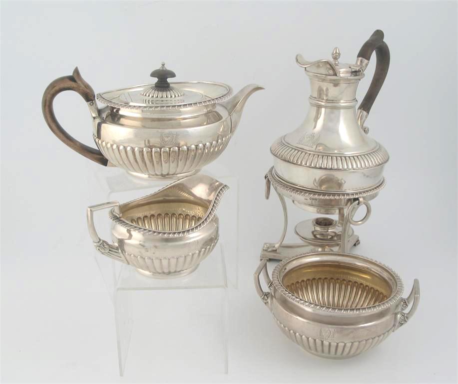 A George III four piece tea service, with part-fluted, circular bodies and gadrooned borders comprising: teapot, milk jug, sugar bowl and hot water jug on stand with burner, crested, by William Burwash & Richard Sibley, London 1812. 97oz. (4)