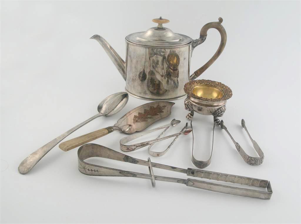 Old Sheffield Plate: a large Argyle, a strainer spoon, a fish slice, a pair of serving tongs, a salt on lion paw feet and four pairs of sugar tongs, mixed makers and dates. (9)