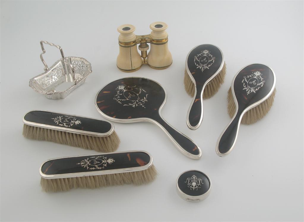 A mixed lot: a modern five piece mounted tortoiseshell dressing table set comprising hand mirror and four brushes with inlaid decoration and initialled 'A', by Adie Brothers, Birmingham 1924, together with a mounted and inlaid tortoiseshell pill box, a plated bon bon basket and a pair of gilt metal and ivory opera glasses. (8)