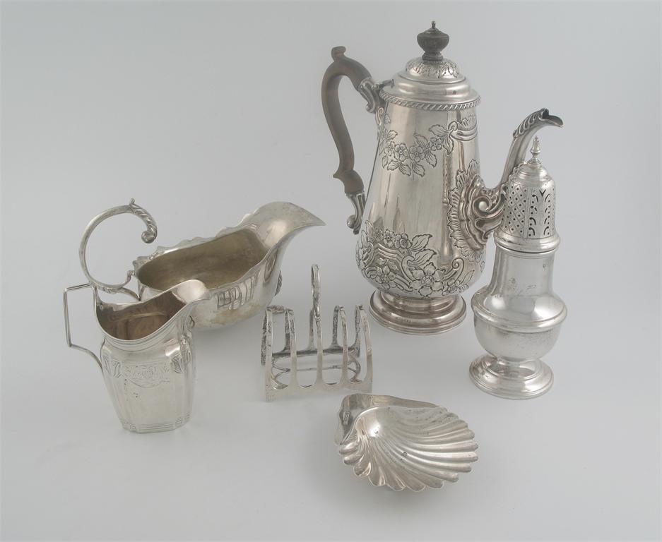 A mixed lot: a George III helmet cream jug, London 1815, the following modern silver: ten fish knives and forks, a pair of shell butter dishes, a baluster caster, small dish, a salver, Sheffield 1952, together with a quantity of plated ware: a muffin dish, pair of sauce boats, coffee pot, ice pail, tea strainer and coffee pot, 41oz weighable silver. (Lot)
