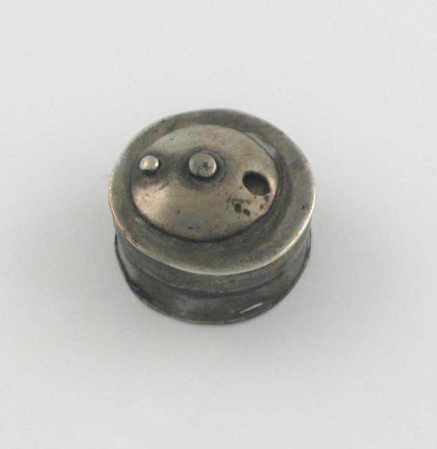 A late 17th/early 18th century circular smelling box, the pull off cover with a domed pivoting aperture for dispensing spice, initialled 'MH' on the base, maker's mark 'T.W', 0.75in (2cm) diameter.