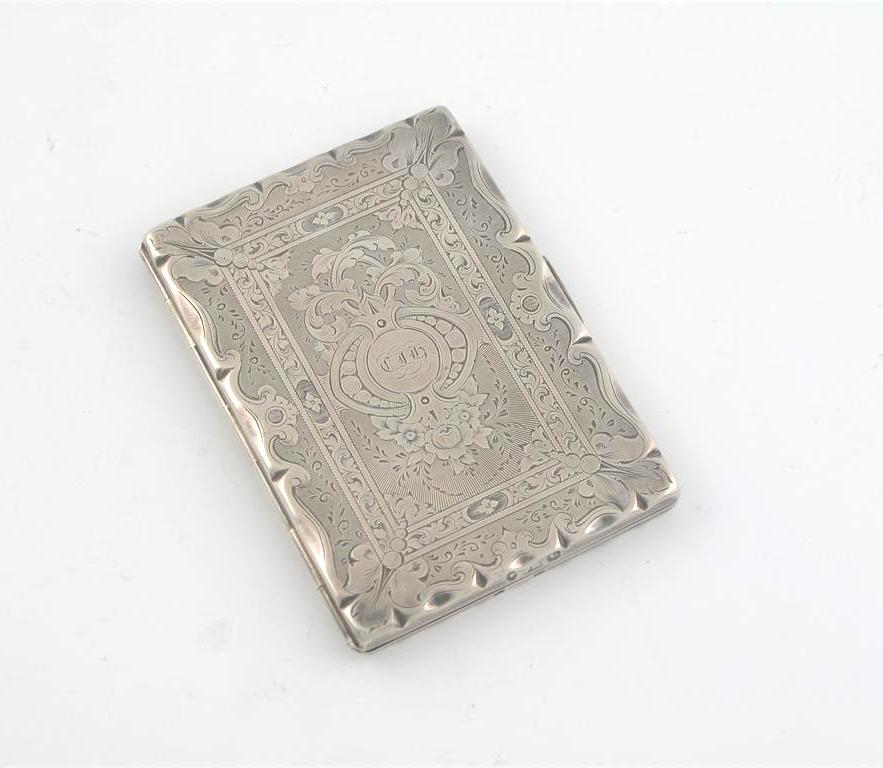 A Victorian card case/note pad, engraved decoration, hinged opening with blue silk lining and fitted pencil, cased.