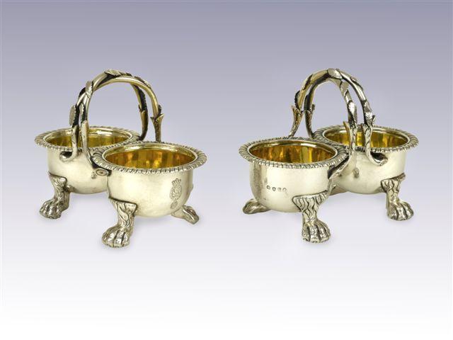 A pair of George III double salts on four paw feet with gadrooned rims and naturalistic handles...