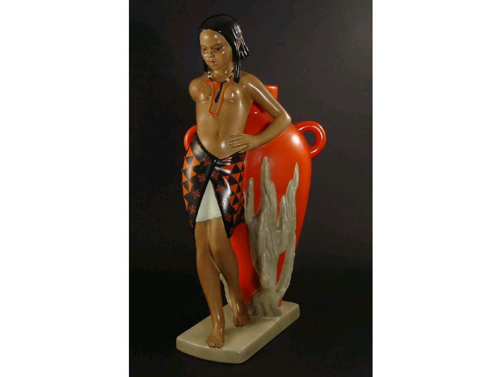 A Lenci pottery figure of a girl modelled resting against a large twin-handled urn painted...
