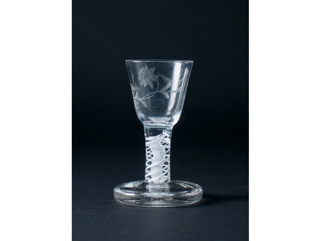 A small wine or toasting glass, the bowl engraved with a flower and a bird, on an opaque twist stem with a heavy circular foot, c.1770, 11cm.