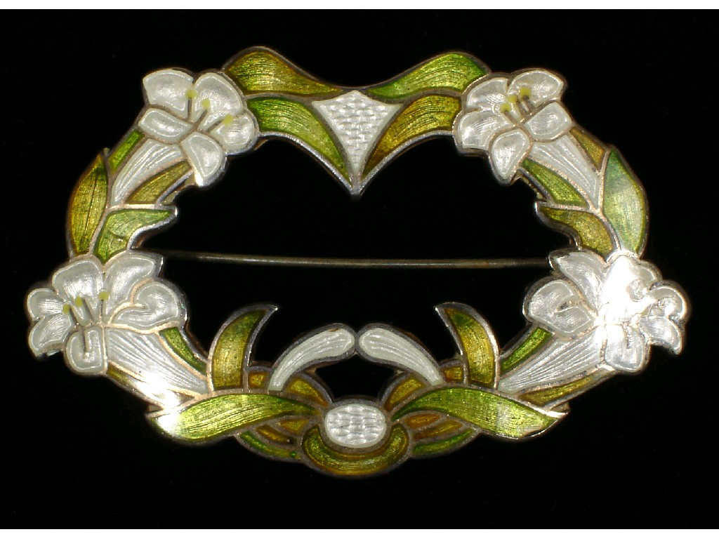An enamelled brooch stamped CH, modelled as a wreath of white lillies, stamped CH mark 7.5cm. wide