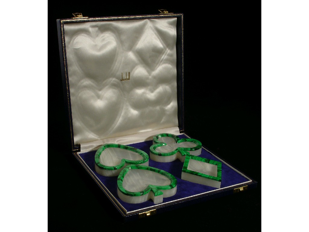 A set of four Dunhill 'Bridge' ashtrays , each malachite and onyx, modelled as a suite motif, in fitted Dunhill presentation case each etched Dunhill, London each 10.5cm. long