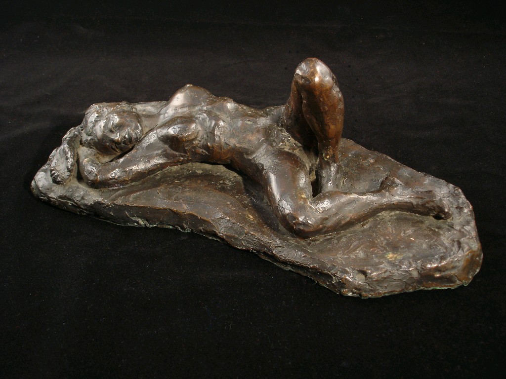 A bronze reclining nude Indistinctly marked Jo 39cm. wide