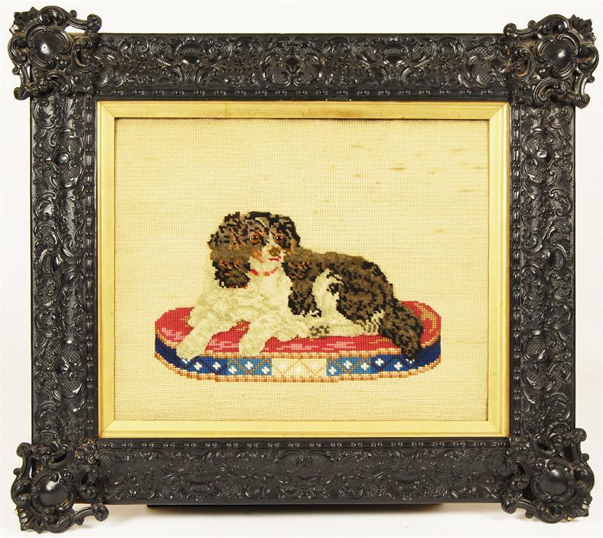 A Victorian felt and woolwork panel of a recumbent King Charles spaniel, 12.5 x 15.5in (32 x 39cm) within an ebonised moulded frame.