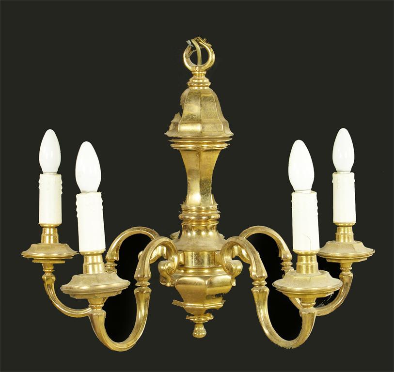 A brass five branch electrolier, the faceted stem issuing scroll arms, with faux candle electric fittings, 18.75in (47.8cm) h, 23in (58.5cm) w.