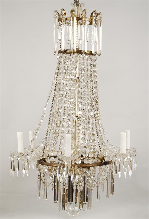 An Edwardian gilt brass and cut glass nine light electrolier, the leaf corona hung with lustres to a trumpet shaped body also with lustres to a main ring with three electric fittings and issuing six scroll branches with faux candle fittings, the base with further lustres and a ball pendant, 46in (117cm) h, 28in (71cm) w.
