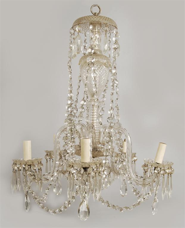 A cut glass six branch chandelier, the petal drip pans to scroll arms a vase shape stem and a faceted ball pendant, hung with lustres and fitted for electricity, 32.5in (82.5cm) h, 24in (61cm) w.