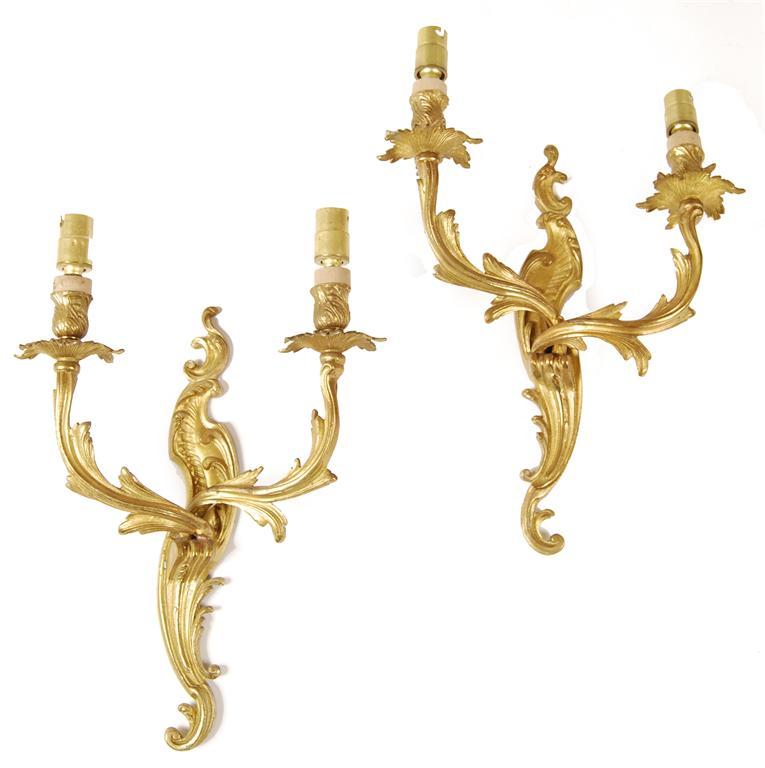 A pair of gilt brass twin branch wall appliques, in rococo style, 16in (40.5cm) h, 11in (28cm) w. (2)