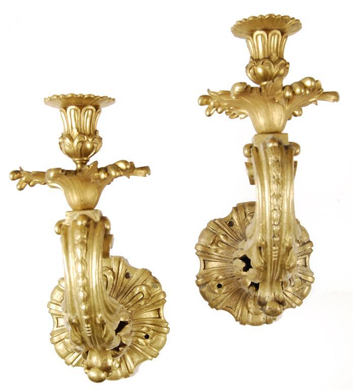 A set of four ormolu single branch wall lights, the leaf domed plates issuing acanthus leaf and scroll branches with conforming drip pan, sconce and ribbed detachable nozzle, 12.5in (31.5cm) h, 10in (25.5cm) d. (4)