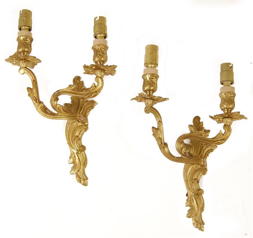 A pair of gilt brass twin branch wall appliques, in rococo style, 14in (35.5cm) h, 8.75in (22cm) w. (2)