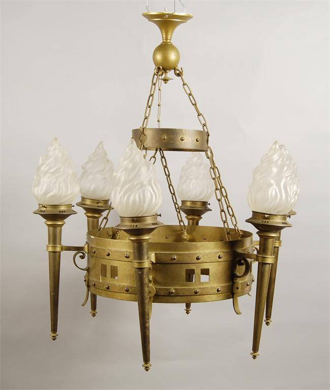 A hammered brass ceiling light, the studded and pierced corona hung with chains to a main ring issuing six torches with faux flame opaque shades, 30in (76cm) h, 33in (84cm) w. Two shades with holes.