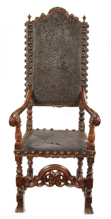 A late 17th century style Portugese walnut high back armchair, the back and seat covered with brass studded embossed leather, on block and turned stretchered supports to 'Braganza' front feet, 58in (147.4cm) h. Old damages, leather on seat torn.