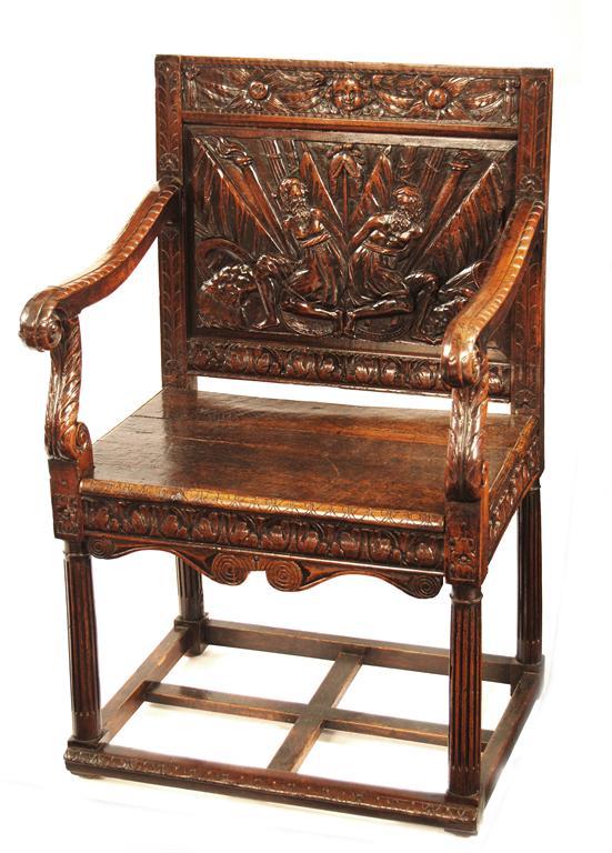 A French carved walnut open armchair, with a rectangular panel back carved two bearded men surrounded by military trophies, the top rail centred a winged cherub's head, florets and drapes, having leaf carved scroll arms to an oak boarded seat and leaf carved seat rail with scroll apron on turned and stop fluted legs united by peripheral and 'X' stretchers, 17th century and later.