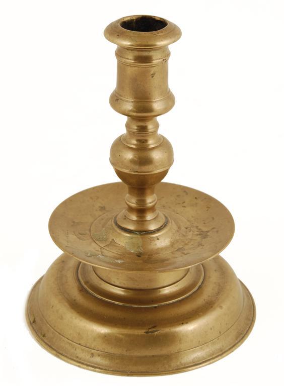 A 16th century bronze 'low bell' candlestick, with a turned sconce and knopped stem and a mid drip pan, 7in (18cm) h.