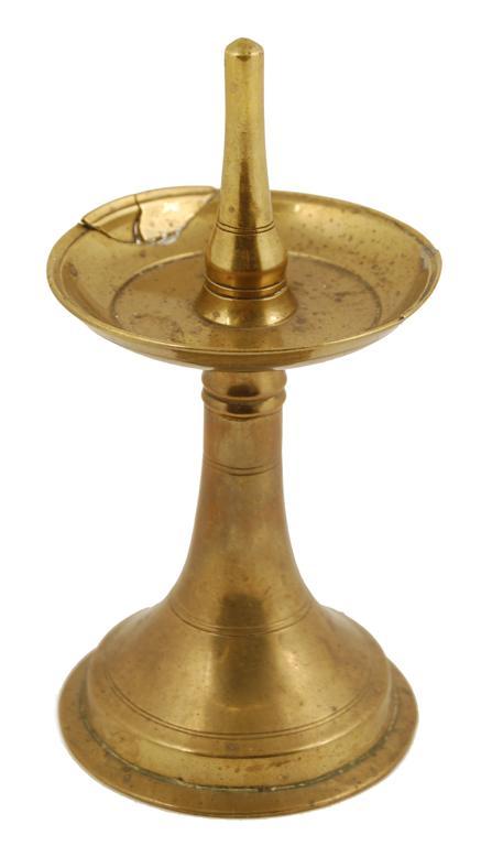 A brass small pricket candlestick, with flared edge drip pan, 6in (15cm) h. Repairs.