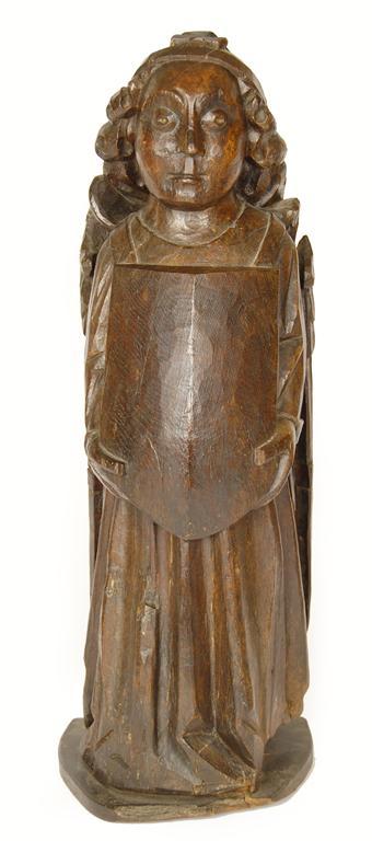 A North European carved oak figure of an angel, holding a vacant shield, possibly 17th century Flemish, on an oak base, 27.75in (68.2cm) h, 9.75in (24.7cm) w. Nose off and re-fixed, old cracks and worm holes.