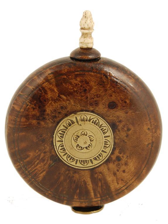 An early 19th century Swedish burr maple snuff flask, with engraved inset brass disks and circular base, with a turned bone and wood stopper, 4in (10cm) h. See Pinto, Treen and other wooden bygones, pl.369 for similar examples.