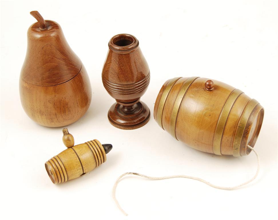 A turned walnut and parcel gilt string barrel, inscribed 'Castellane' with screw off cover, base missing, 5in (12.5cm) l, another smaller barrel, a turned treen pear shape box and cover, and a turned spill vase. (4)